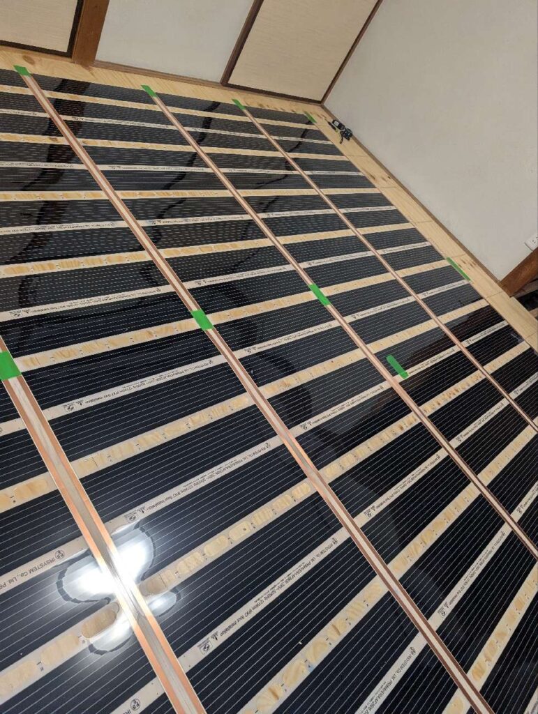 こちらのシートタイプの床暖房、施工も簡単なうえコストも抑えられ、この上からフローリングを張っていける優れものです。