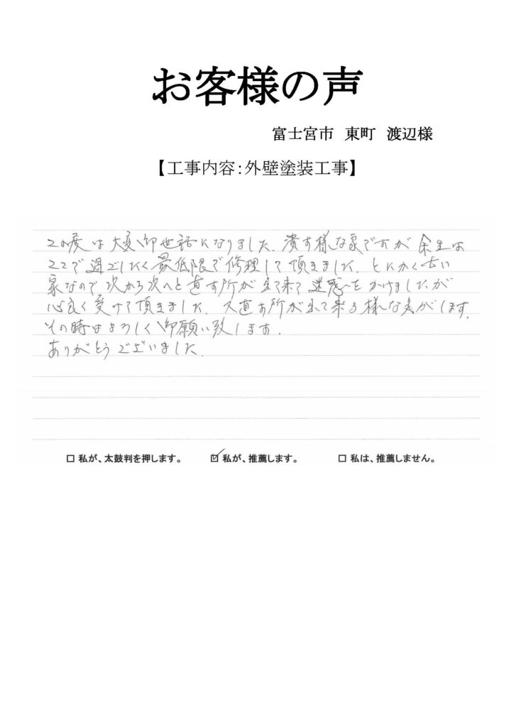 この度は大変お世話になりました。潰す様な家ですが余生はここで過ごしたく最低限で修理して頂きました。とにかく広い家なので次から次へと直す所が出てきて迷惑をかけましたが、心良く受けて頂きました。又、直す所が出てくる様な気がします。