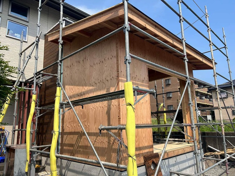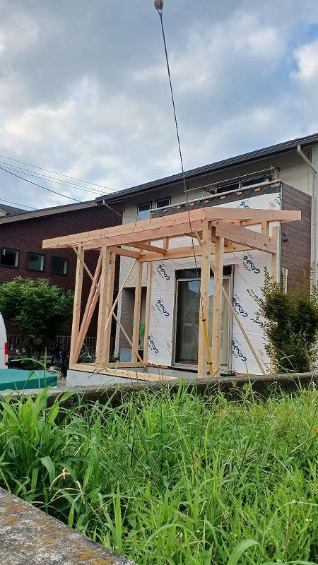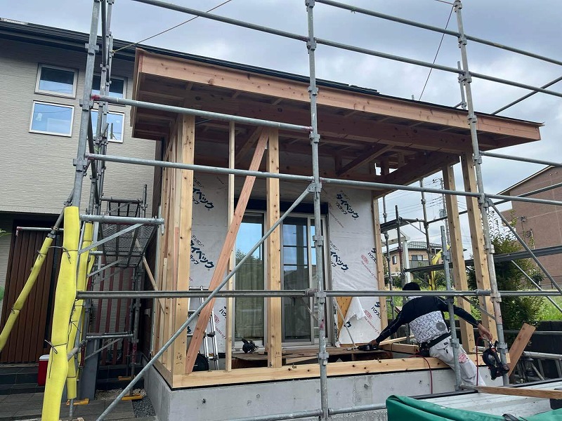 - 増築工事 屋根貼り・サイディング貼り・サッシ取付・樋取付・木部塗装・破風塗装・軒天塗装・フローリング貼り・クロス貼り