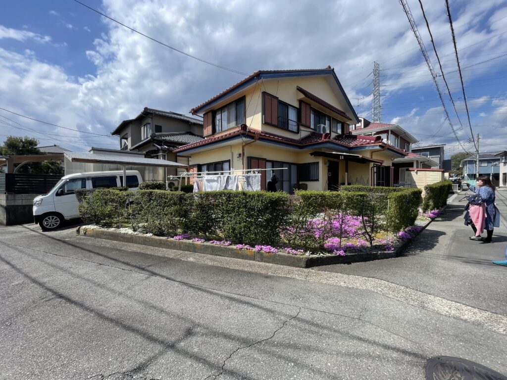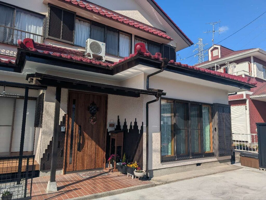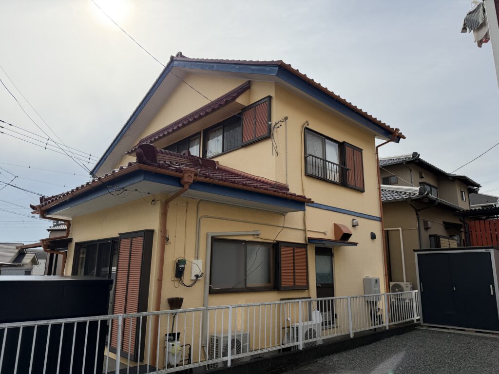 数年前に塗装されたということで黄色の外壁、ブルーの破風で素敵な外観でしたが、今回屋根の瓦の色に合わせて